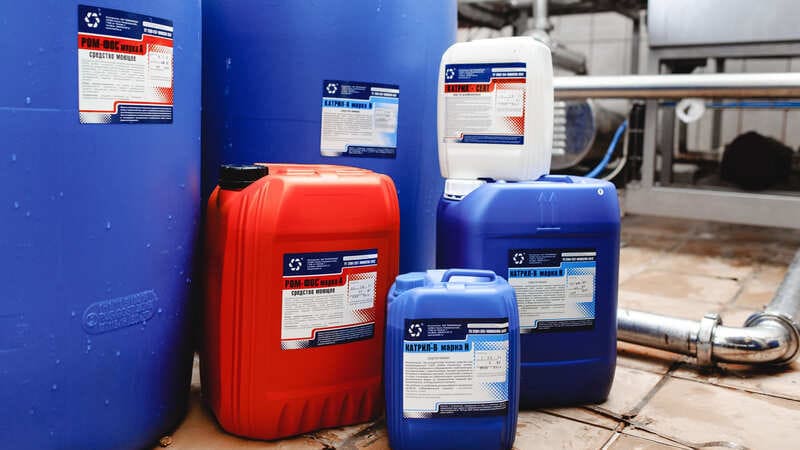 Синий цвет канистры – для щелочных средств, в том числе дезинфицирующих с моющим эффектом.