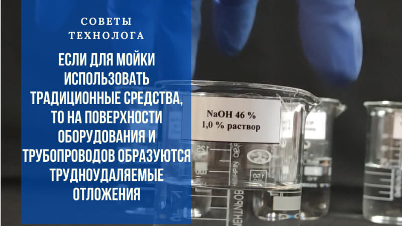Если для мойки используют традиционные средства, такие как каустик (NaOH), то необходимо помнить, что растворы каустической соды взаимодействуют с солями жесткости и образуют на поверхности оборудования и трубопроводов трудноудаляемые отложения, которые снижают качество санитарной обработки.
