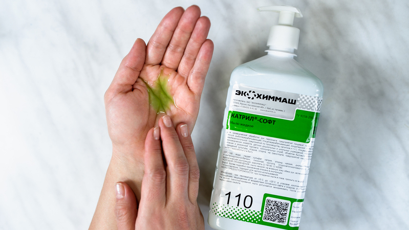 - первая стадия – жидкое мыло Катрил-Софт. Если предъявляются повышенные требования к санитарии, то можно использовать кожный антисептик (жидкое мыло) Катрил-Лайт.