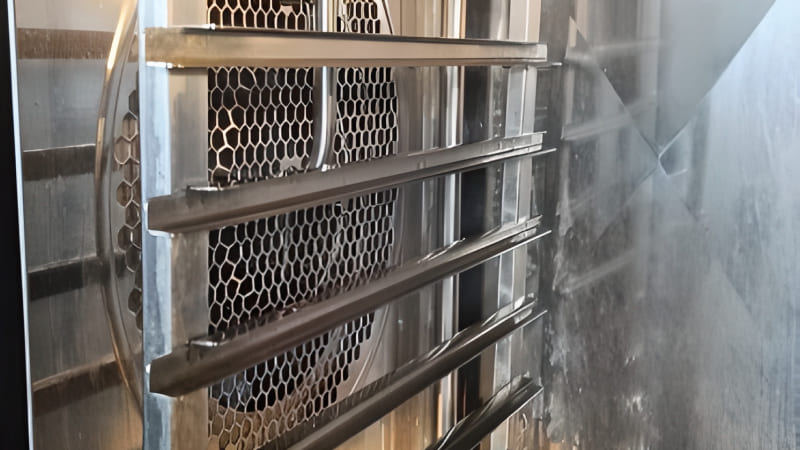 После цикла мойки: остались загрязнения там, куда струя воды не доставала из-за конструктивной особенности. Далее было проведено ополаскивание пароконвектомата из шланга. Загрязнения полностью удалились.